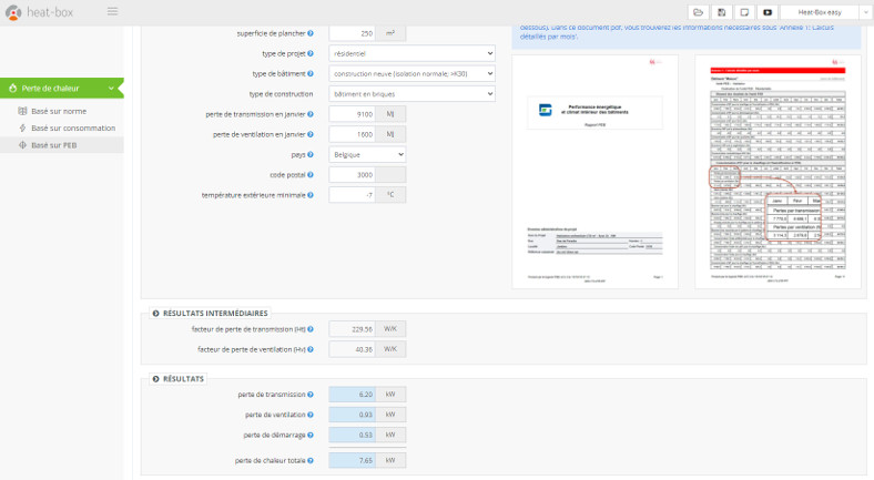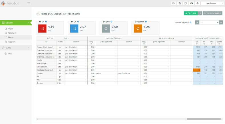 Le calcul suit la norme NBN EN 12831 -1 et calcule la puissance nécessaire au niveau du bâtiment et de la pièce.